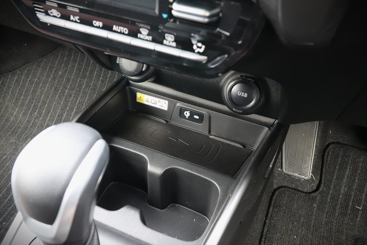 最新のクルマらしくパーキングブレーキは、ホールド機能つきの電動式。そのスイッチの後ろには、シートヒーターのスイッチもあります。さらにシフトレバーの前方を見ると、ワイヤレス充電のトレイが。USBケーブルなどを持ち込まなくてもスマートフォンを"置くだけ"で充電できる、便利アイテムです。