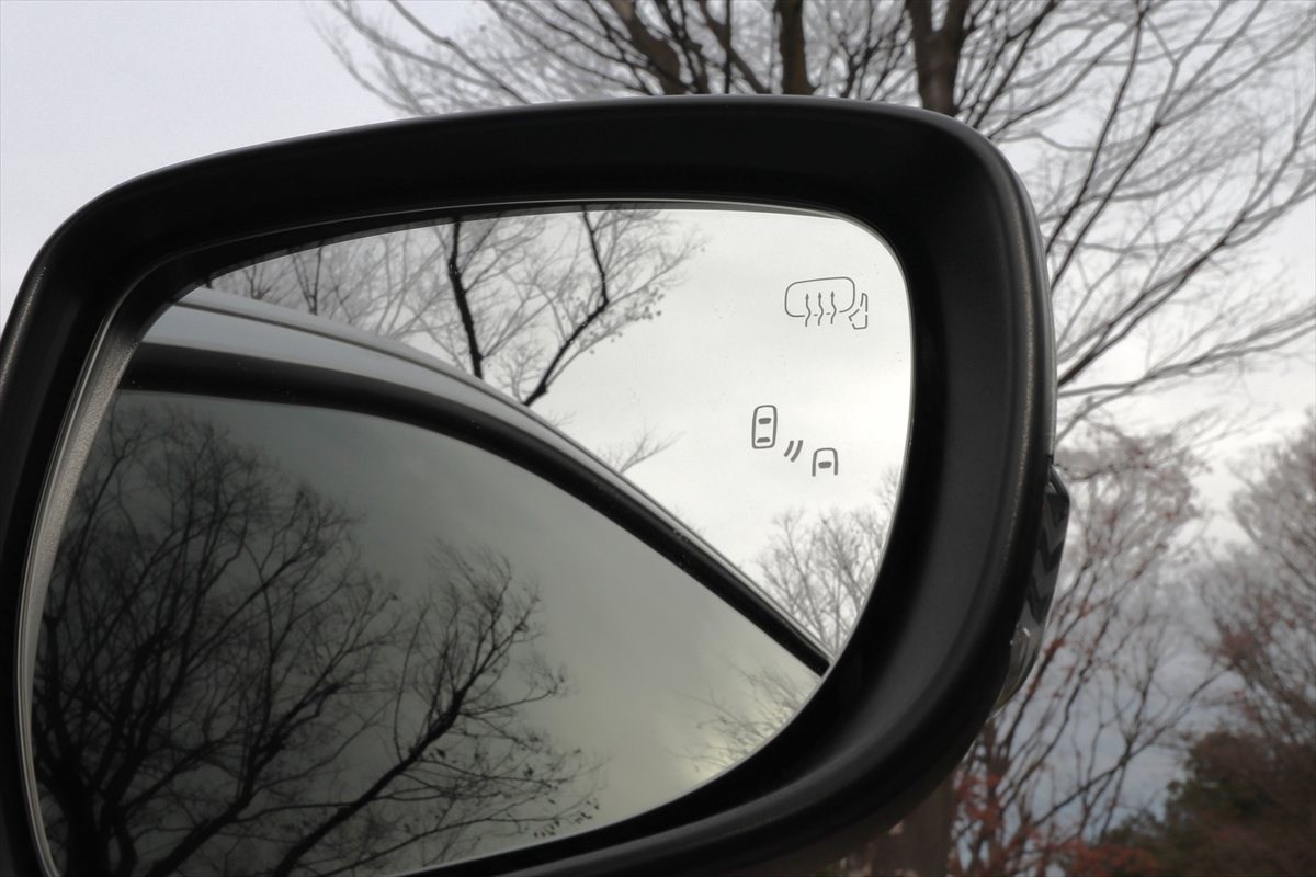 2車線道路に出て気づくのは、ブラインドスポットモニターがついていること。斜め後方の見えづらい部分を走るクルマを、ドアミラーにつくインジケータの点灯で教えてくれます。